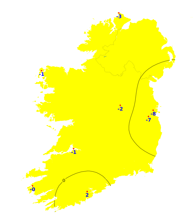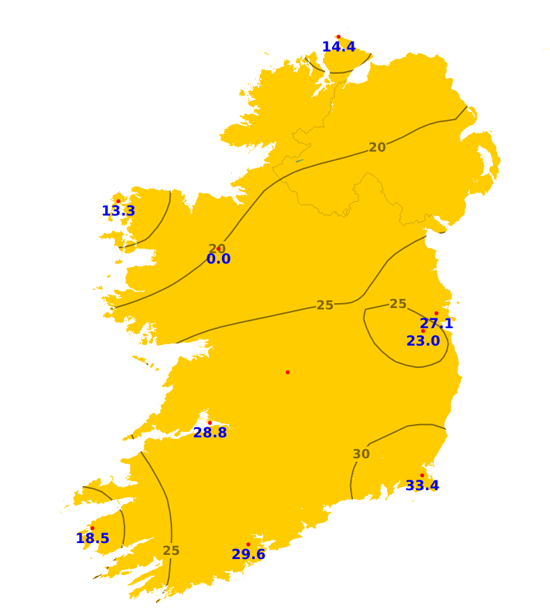 Rainfall accumulations for the past seven days were close to normal or below for most stations, though was above average for some midland and eastern areas. Accumulations ranged between 13.6mm at Oak Park, Co. Carlow (66% of its average) to 43.3mm at Gurteen, Co. Tipperary (189% of its average). Malin Head, Co. Donegal recorded the lowest percentage of its average with 54% or 17.7mm. Over the coming week, there will be rain and showers each day, driest though on Tuesday and Wednesday. It will turn wet on Thursday and will then continue unsettled through the rest of the week. Overall, rainfall amounts will likely range between 25 and 60mm generally, higher in the southwest. This equates to between 110% and 225% of normal amounts for the time of year.