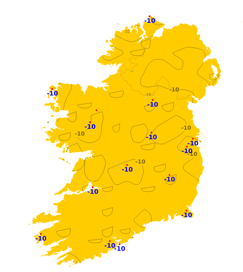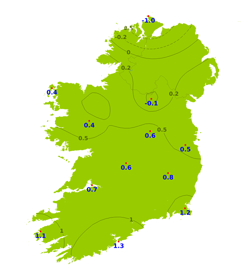 Mean air temperatures for the past week were close to or above average for much of the country, ranging from 4.8 degrees at Knock/Ireland West Airport, Co. Mayo (0.6 degrees above normal) to 8.3 degrees at Valentia Observatory, Co. Kerry (1.1 degrees above normal). However, mean air temperatures at Malin Head, Co. Donegal were a degree lower than its average. Mean soil temperatures were above average throughout the country, ranging between 5.2 and 8.1 degrees which is between 1.1 and 2.9 degrees above normal. Over the coming days, temperatures will fluctuate with some frosts at night, especially Monday night, but indications are for temperatures to increase for Friday onwards. Overall, mean air temperatures will likely be 2 or possibly 3 degrees warmer than average. Mean soil temperatures will continue above average too.