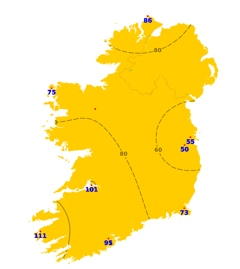 Sunshine amounts were close to or above average in the south-west and mid-west with 16 hours or greater recorded, highest at Valentia Observatory, Co. Kerry with 16.6 hours. Elsewhere, it was duller with 3.9 hours at Gurteen, Co. Tipperary to 13.7 hours at Malin Head, Co. Donegal. While there will be sunshine at times, the coming week will be mostly unsettled with below average sunshine amounts expected generally.