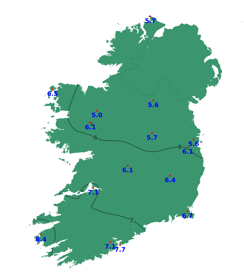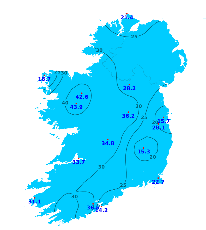 Rainfall amounts were above average for most areas over the past week, generally ranging between 107% and 210% of average. However, it was drier or closer to average in some southern, western and northwestern coastal fringes with accumulations between 77 and 102% of normal. It was wettest across the Midlands and Midwest with 43.9mm recorded at Claremorris in County Mayo. The driest location was Roches Point in County Cork which recorded 14.2mm over the 7 day period. Over the coming week, our weather will continue mostly unsettled with rainfall expected to be between 137% and 293% of average. The wettest conditions will be across southern and western regions.