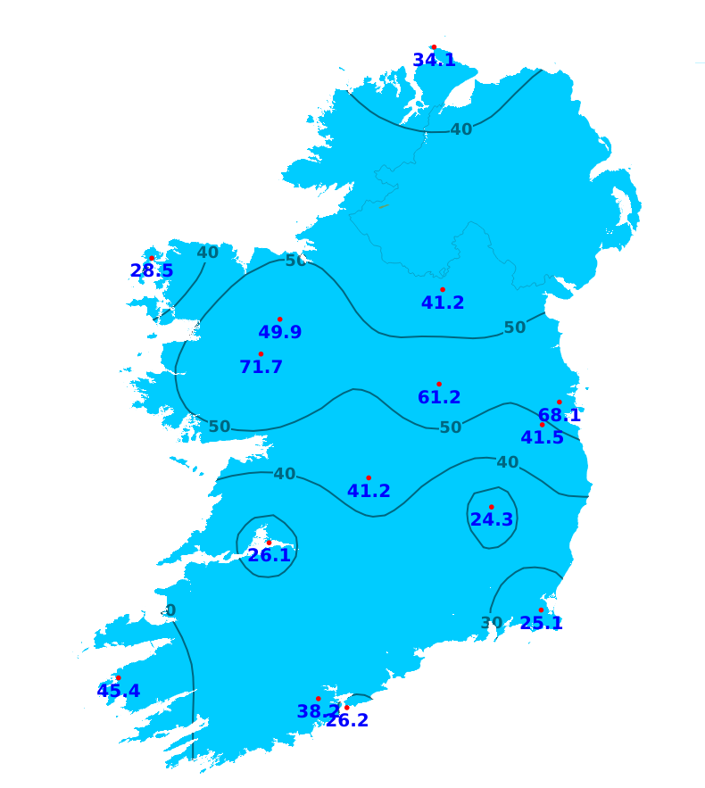Over the past seven rainfall amounts were above average across the country, ranging between 110 and 160% of normal for most northern, western and southern counties, up to 550% of normal in the east. Knock/Ireland West Airport, Co. Mayo recorded the most with 71.7mm (281% of its average) while Johnstown Castle, Co. Wexford recorded the least with 25.1mm (131% of its average). Over the coming week, while there will be some drier intervals, especially later today (Monday) and much of tomorrow away from the southwest, our weather will continue mostly unsettled with 200 to 350% of the average rainfall amounts expected over the coming week.