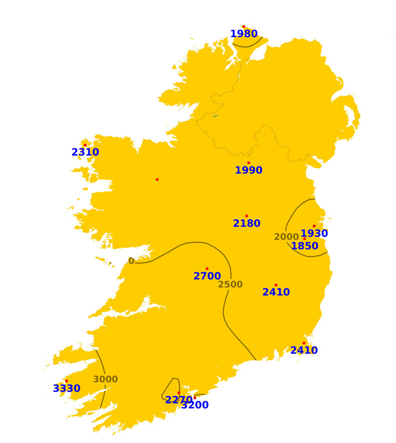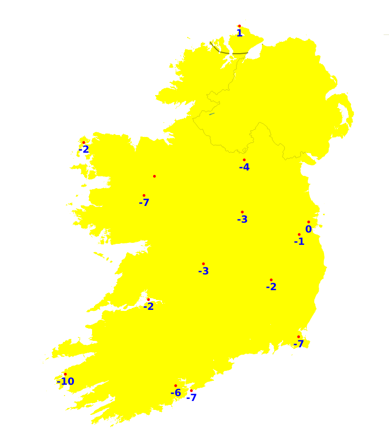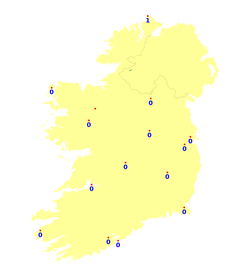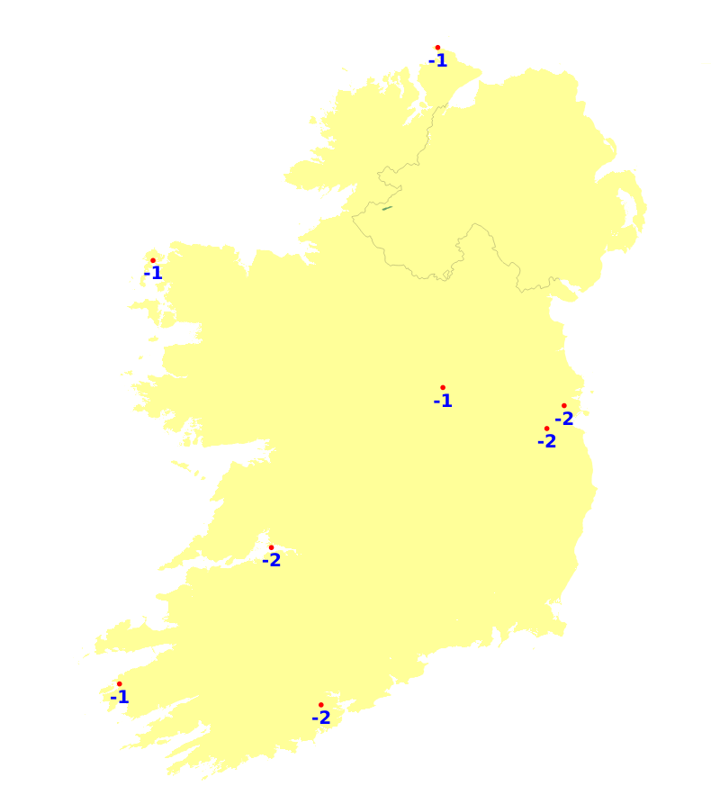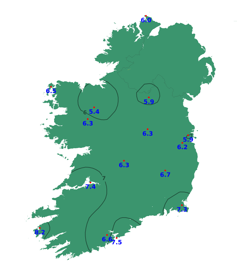 Mean air temperatures were generally average or slightly above this week ranging between -0.2 and +1.2 degree. The lowest mean air temperature was recorded at Knock Airportm, Co. Mayo which was 4.8 degrees (0.6 degrees above average). The highest was recorded at Valentia Observatory, Co. Keery with 8.2 degrees (1 degree above average). Mean soil temperatures were all above average this past week, ranging between 1.2 to 3 degrees, with the mildest temperatures in the east. Mean air temperatures will be a degree or 2 above average this coming week, ranging between 6 and 10 degrees, mildest in the south-west.