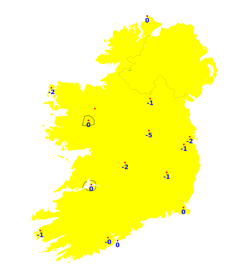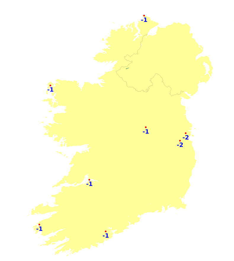 Mean air temperatures over the past week were mostly above average, ranging from 5.8 degrees at Knock/Ireland West Airport, Co. Mayo and 7.5 degrees at Roche's Point, Co. Cork. This is roughly 0.7 to 1.7 degrees above average.