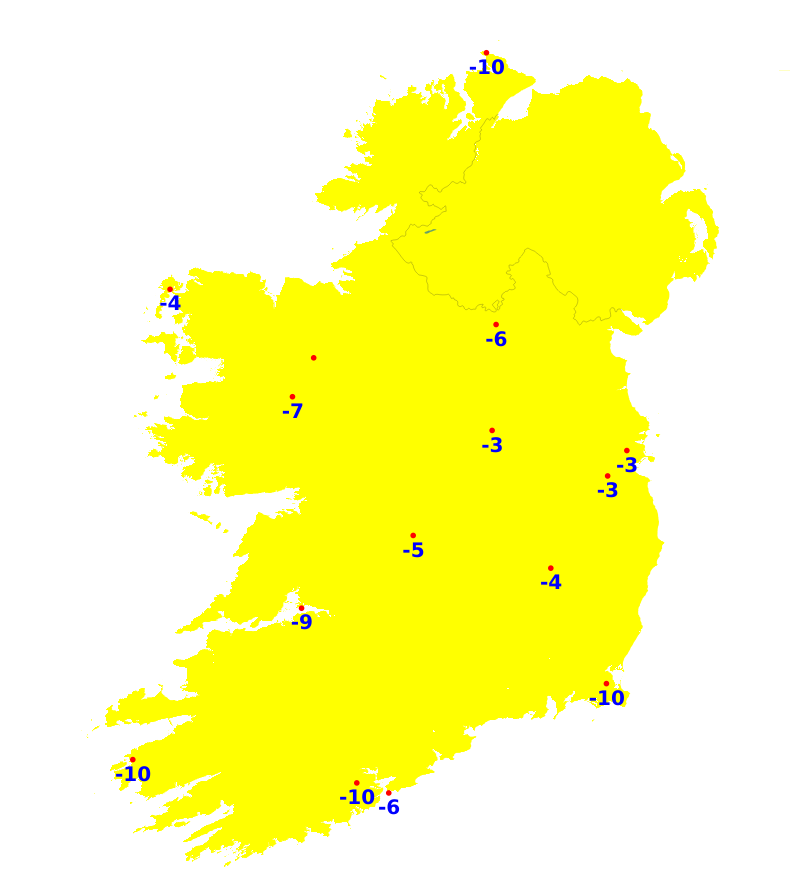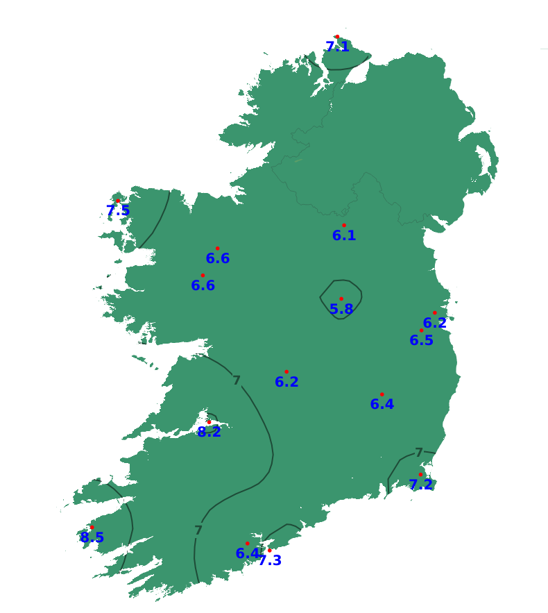 Mean air temperatures were above normal nationwide, ranging from 6.0 degrees Celsius at Mullingar and Knock to 8.8 degrees Celsius at Valentia. All reporting stations showed positive anomalies.