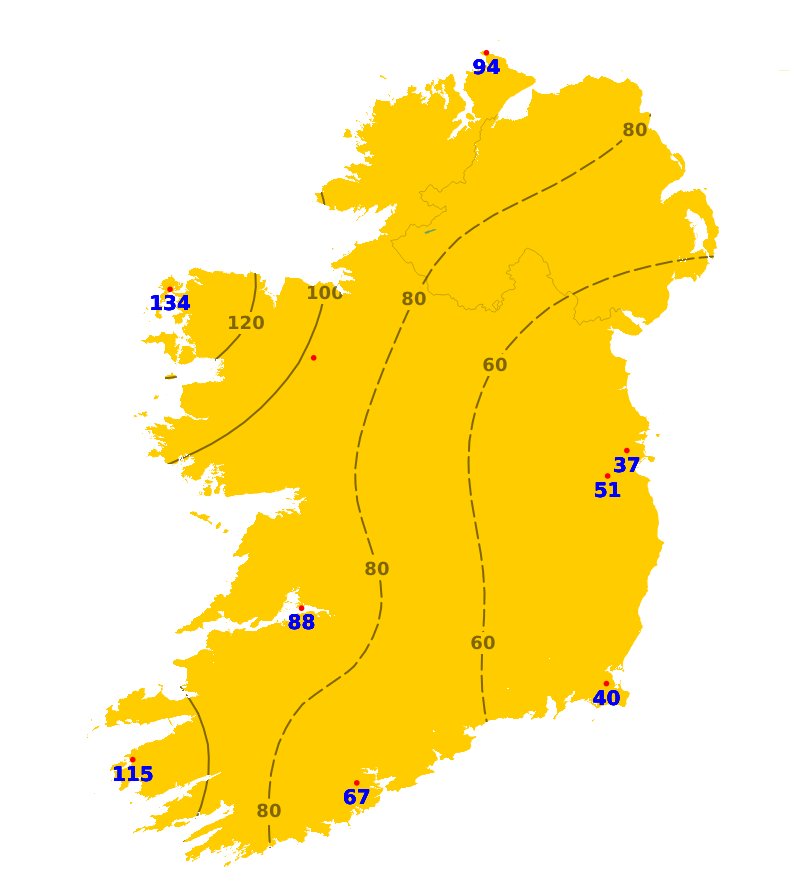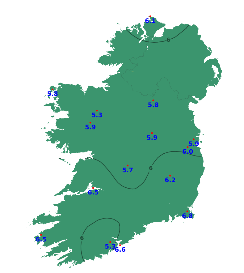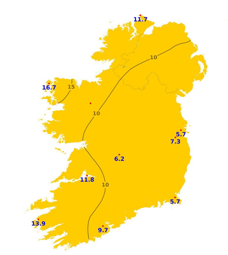 Sunshine amounts in the east and south were generally below normal recording between 37 to 67% of average. Amounts were higher in the far west with 13.9 hours recorded in Kerry and 16.7 recorded in Mayo which is roughly 115 to 134% of average. Sunshine amounts will likely continue to be variable over the coming week with the best of the sunshine in the west.