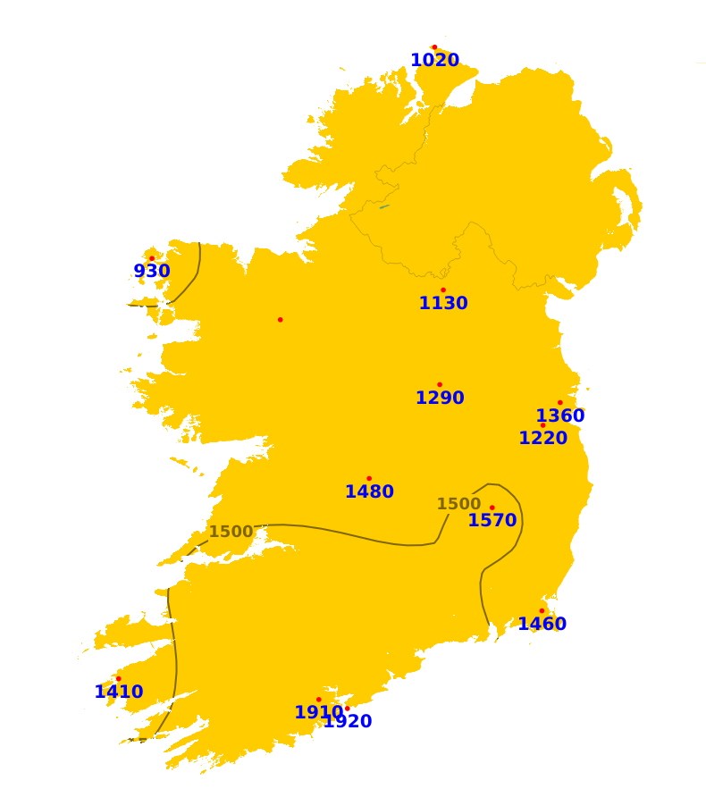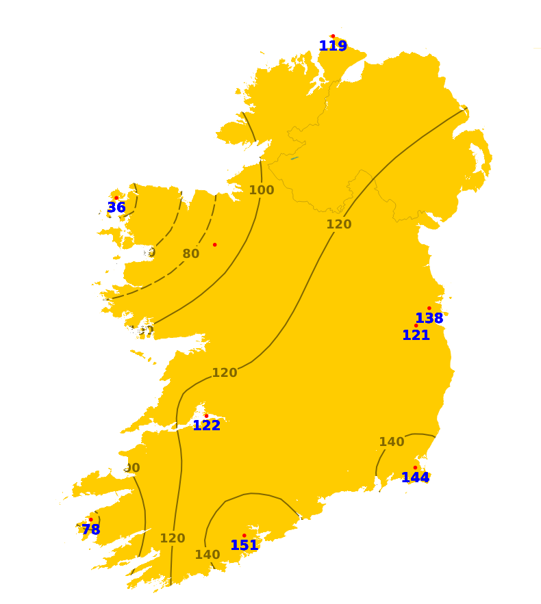 Sunshine amounts varied significantly. Western stations, such as Belmullet (36% of normal), were dullest, while southeastern and midland stations recorded higher values, including Johnstown Castle (144%) and Shannon Airport (122%).Sunshine in the coming period will be variable, with alternating cloudy intervals and occasional brighter spells.