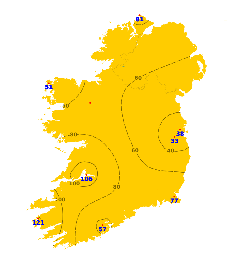 Sunshine amounts varied this past week ranging between 33% to 121% of average. In general most areas were below average with only 5.6 hours recorded at Casement Aerodrome, Co. Dublin. The south-west was the exception where sunshine was generally above average. The highest total was recorded at Valentia Observatory, Co. Kerry recorded 17.8 hours of sunshine. The coming 7 days should see a mix of cloud and sunnier spells, meaning sunshine amounts will be expected to increase.