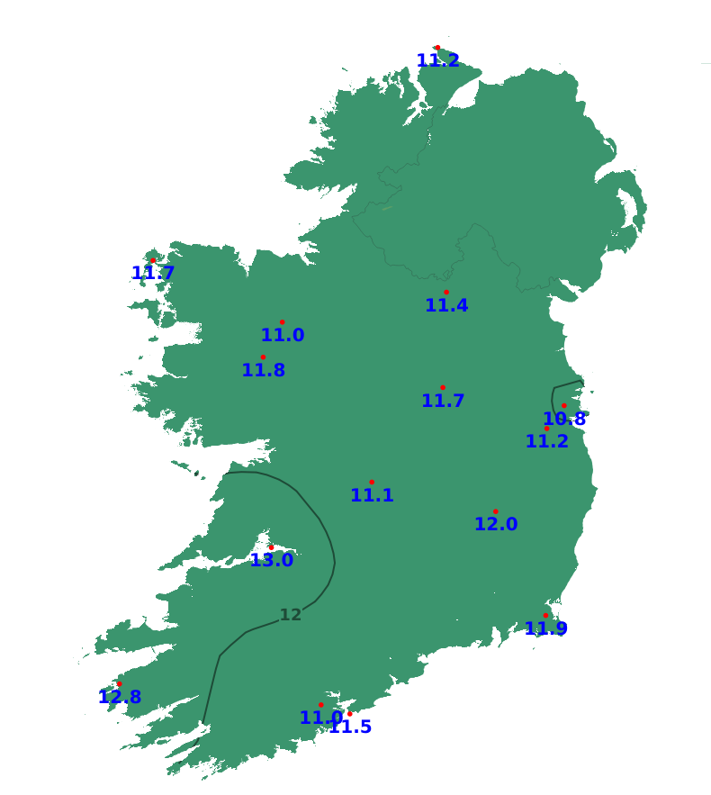 Mean air temperatures were above average nationwide over the past week, ranging from 11.3 degrees Celsius at Knock Airport to 11.8 degrees Celsius at Shannon Airport, 0.4 and 1.3 degrees Celsius above normal. It was mildest in the west. Mean soil temperatures were also notably above average, by around 1.5 to 3.0 degrees Celsius, ranging between 10.8 and 13.0 degrees Celsius. Through the week ahead, temperatures will gradually decrease, with mean air values expected to fall to around 8 to 11 degrees Celsius, which is normal or slightly below average for late October.
