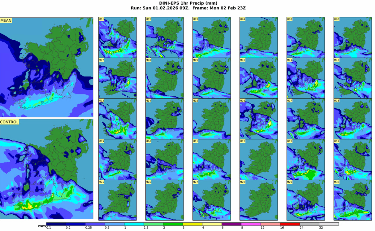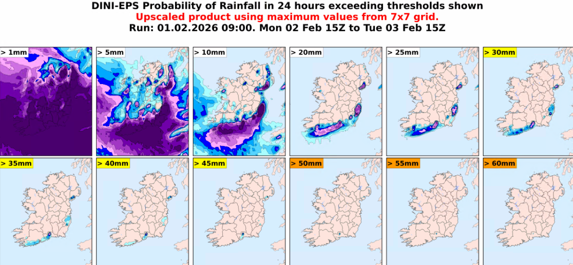 Met Éireann’s own ensemble forecasting system (DINI-EPS) shows a range of possible outcomes of the rainfall associated with this system. While areas may not reach warning thresholds, flooding remains a likelihood. A status yellow rainfall warning has been issued due to the potential for further heavy rain and showers in areas that have already seen significant flooding due to Storm Chandra.