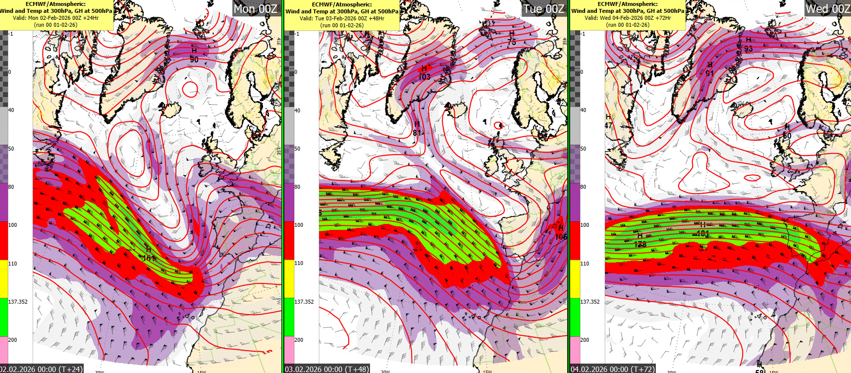 A strong polar front jet, as a result of the cold air outbreak over North America, will see the system deepen rapidly to the south of Ireland within the left exit of the jet stream. The storm will approach the south coast overnight before tracking northwards over Ireland during Tuesday.