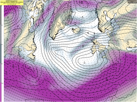 Figure 1: Mean sea level pressure and Jet Stream valid at 1200 Thursday 5th February