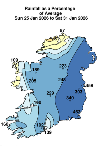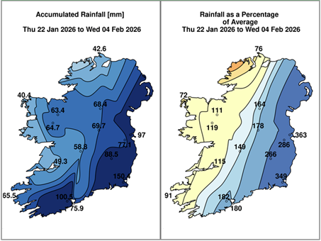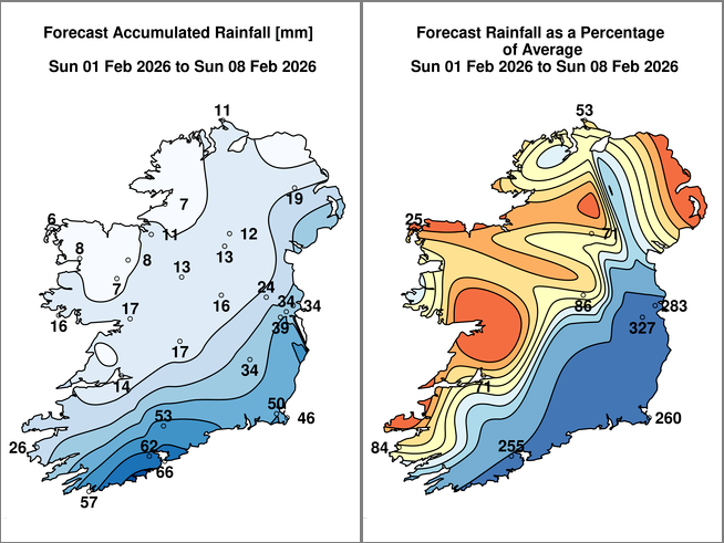 The persistent weather pattern, with a southerly shifted jet stream continuing to generate low pressure to the south and southwest of Ireland, continues through the forecast outlook period. As a result, rainfall amounts will remain above average in the south and east of the country while western and northwestern parts of the country are expected to see generally average or below average rainfall accumulations.
