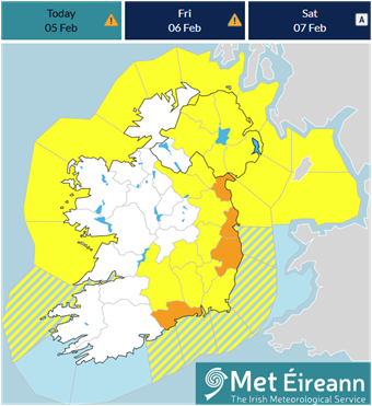 Monitor Met Éireann forecasts and/or visit https://www.met.ie/ for the most up to date information. Information is available across social media platforms and other news media sources.