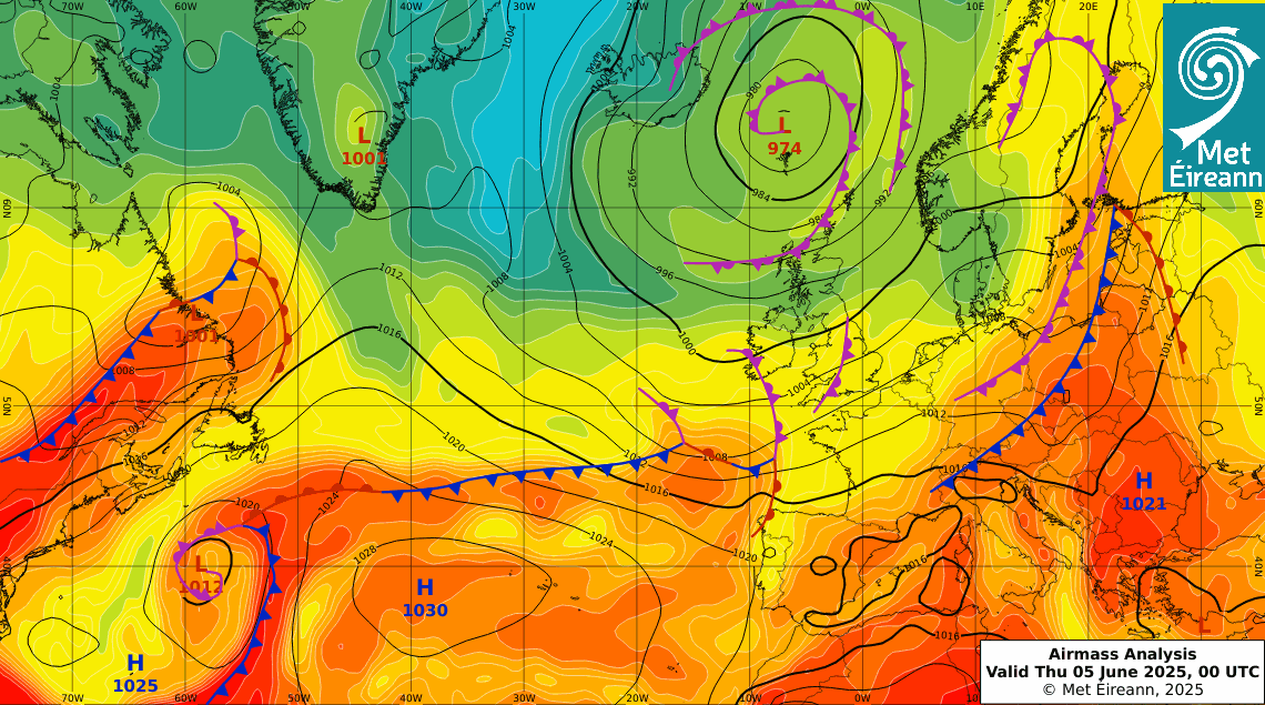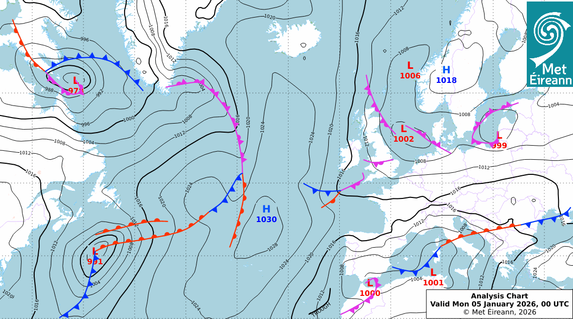 Léiríonn na cairteanna anailíse seo an pátrún brú dromchla thar an Atlantach Thuaidh agus san Eoraip ag 00UTC inniu. Léiríonn siad iseabair (línte faoi bhrú comhionann) agus léiríonn siad réimsí ardbhrú (H) agus brú íseal (L) mar aon lena luach brú lárnach. Léirítear iseabair le línte dlútha dubha gach 4 hPa agus na hiseabair níos tiubha gach 16 hPa. Is gnách go mbíonn baint ag brú ard le haimsir shocraithe tirim den chuid is mó le gaotha éadroma agus bíonn brú íseal bainteach go hiondúil le haimsir athraitheach a bhíonn fliuch agus gaofar go minic. Dá ísle an brú i gcoitinne is ea is láidre na gaotha agus is troime an bháisteach (hairicín an sample is foircní). Is iad frontaí an teorainn idir aermhaiseanna éagsúla; tá fronta fuar gorm, tá fronta te dearg agus tá oclúid corcra. Aeráid na hÉireann