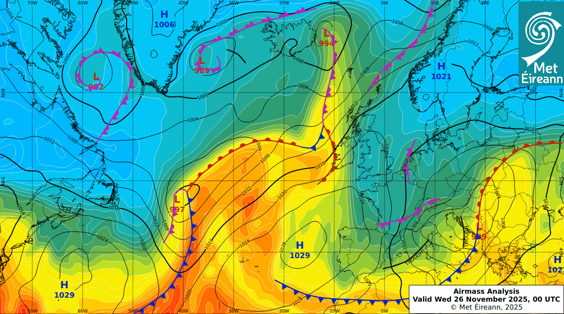 Airmass Analysis (850hPa Wet Bulb Potential temperature, Surface Pressure & Fronts) at 00UTC Dé Céadaoin 26 Samhain 2025