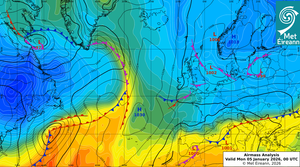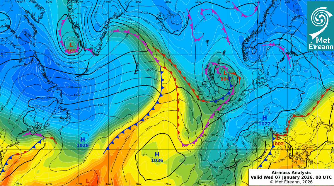 Airmass Analysis (850hPa Wet Bulb Potential temperature, Surface Pressure & Fronts) at 00UTC Dé Céadaoin 07 Eanáir 2026