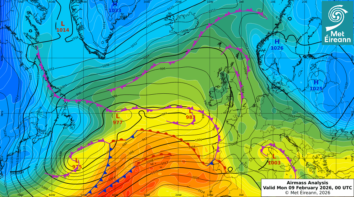 Airmass Analysis (850hPa Wet Bulb Potential temperature, Surface Pressure & Fronts) at 00UTC Dé Luain 09 Feabhra 2026