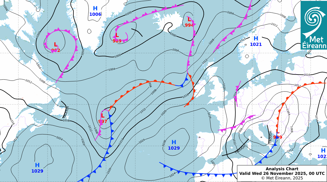 Surface Pressure & Frontal Analysis at 00UTC Dé Céadaoin 26 Samhain 2025