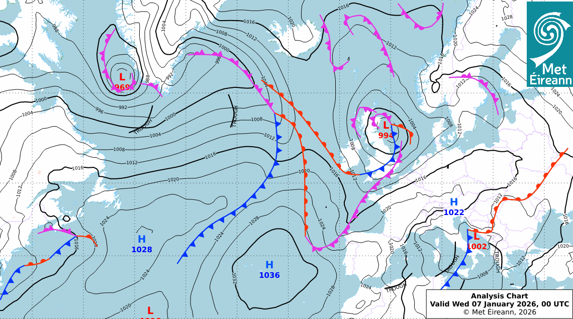 Surface Pressure & Frontal Analysis at 00UTC Dé Céadaoin 07 Eanáir 2026