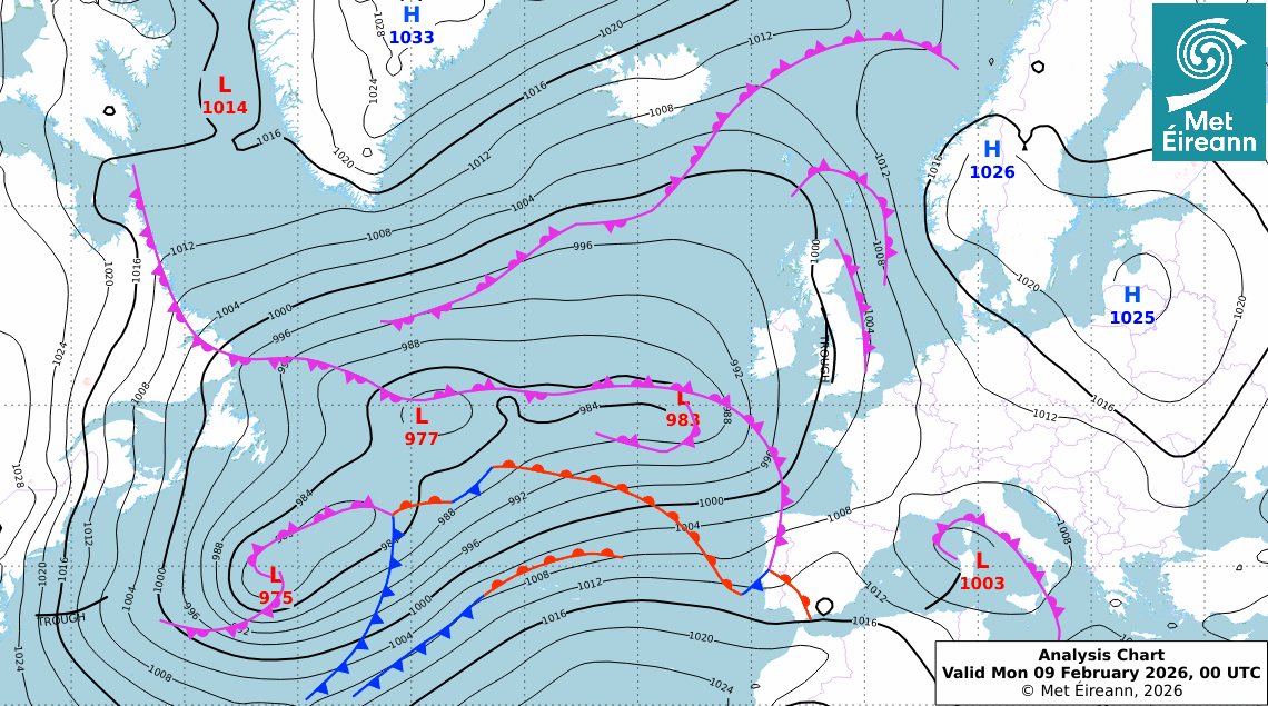 Surface Pressure & Frontal Analysis at 00UTC Dé Luain 09 Feabhra 2026