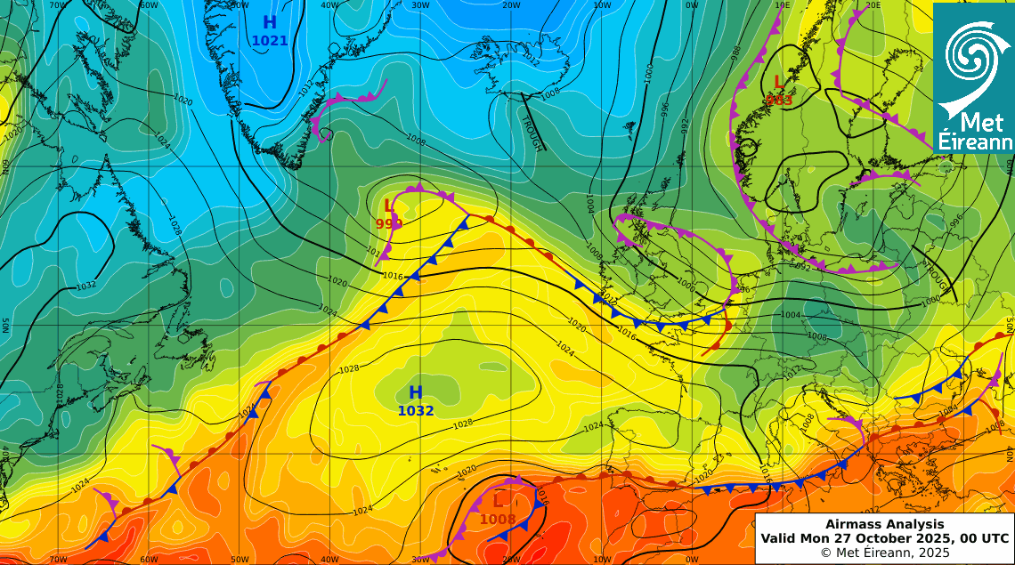 Airmass Analysis (850hPa Wet Bulb Potential temperature, Surface Pressure & Fronts) at 00UTC Monday 27 October 2025