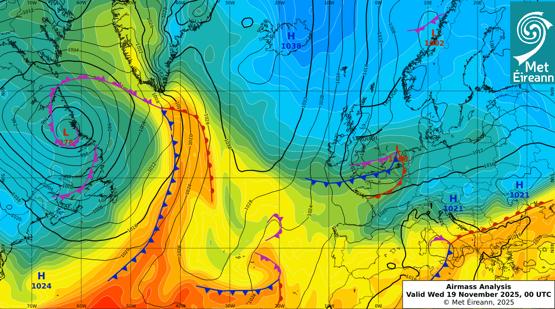 Airmass Analysis (850hPa Wet Bulb Potential temperature, Surface Pressure & Fronts) at 00UTC Wednesday 19 November 2025