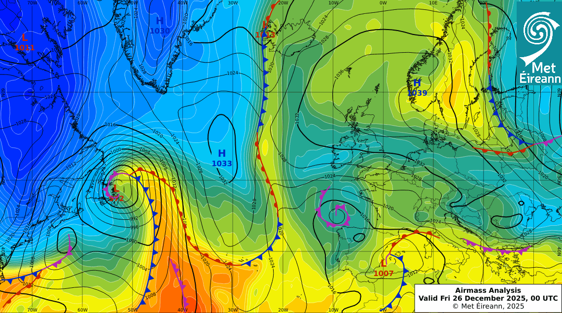 Airmass Analysis (850hPa Wet Bulb Potential temperature, Surface Pressure & Fronts) at 00UTC Friday 26 December 2025
