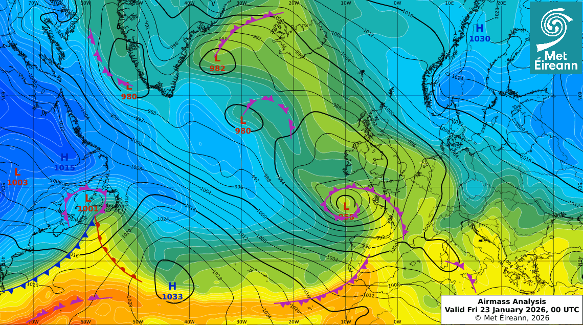Airmass Analysis (850hPa Wet Bulb Potential temperature, Surface Pressure & Fronts) at 00UTC Friday 23 January 2026