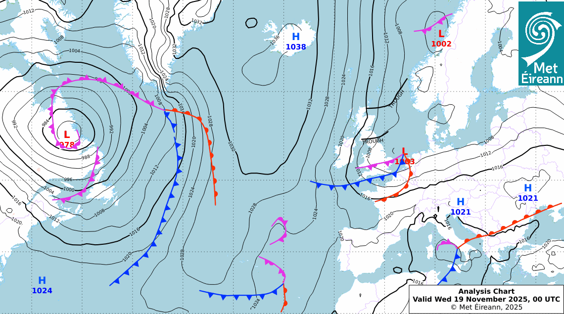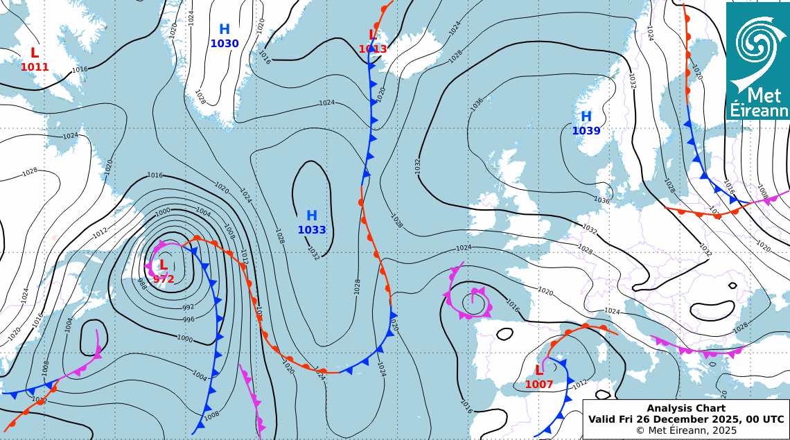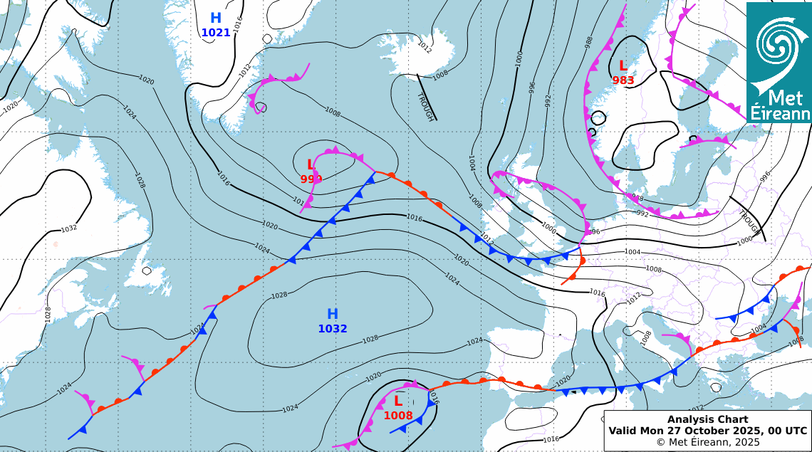 These analysis charts show the surface pressure pattern over the North Atlantic and Europe at 00UTC today. They display isobars (lines of equal pressure) and indicate areas of high (H) and low pressure (L) along with their central pressure value. Isobars are represented by solid black lines every 4 hPa with the thicker isobars every 16 hPa. High pressure is usually associated with mainly dry, settled weather with light winds while low pressure is normally associated with unsettled weather which is often wet and windy. The lower the pressure generally the stronger the winds and the heavier the rain (a hurricane being the most extreme example). Fronts are the boundary between different airmasses; a cold front is blue, a warm front is red and an occlusion is purple. Climate of Ireland